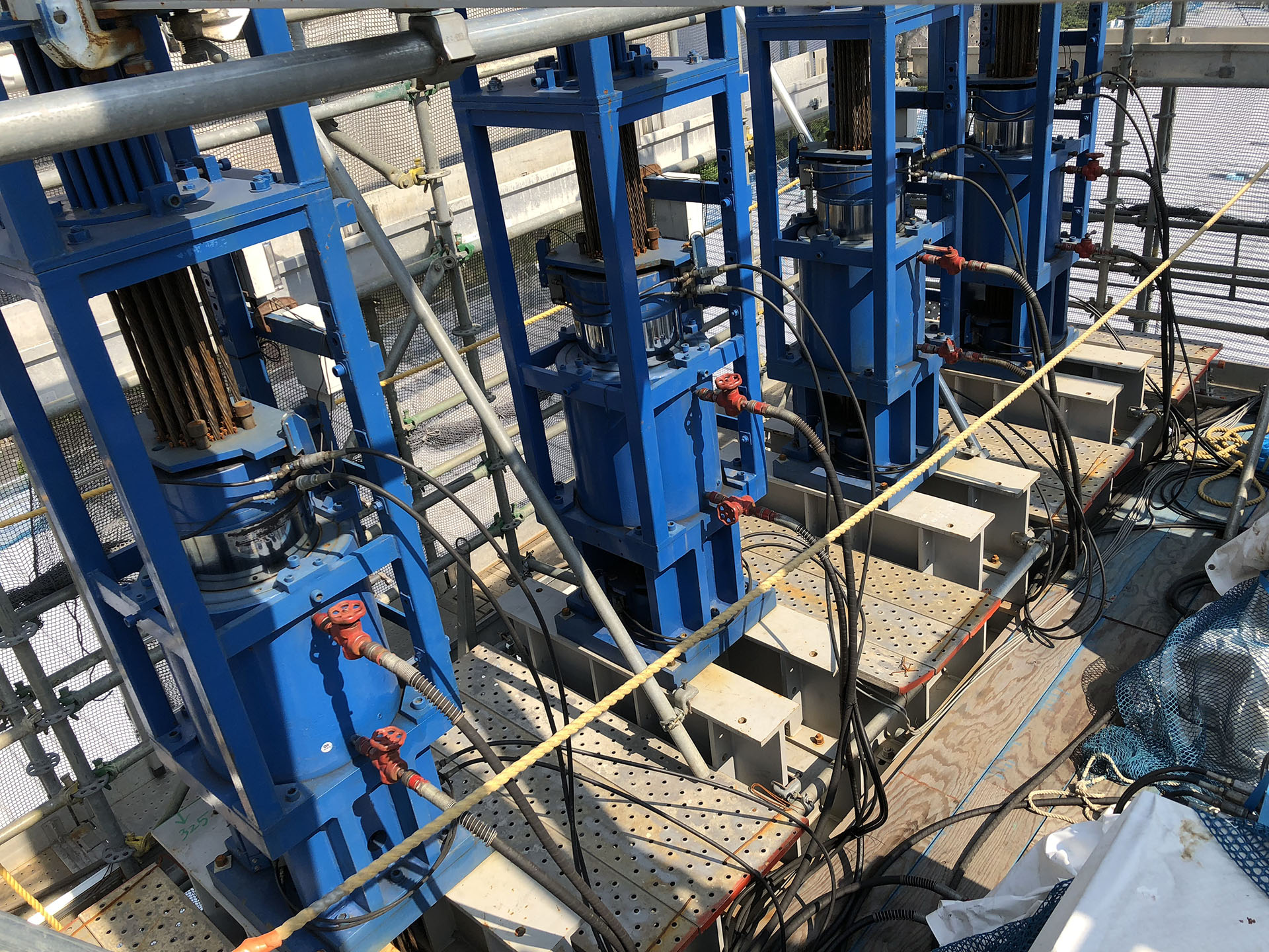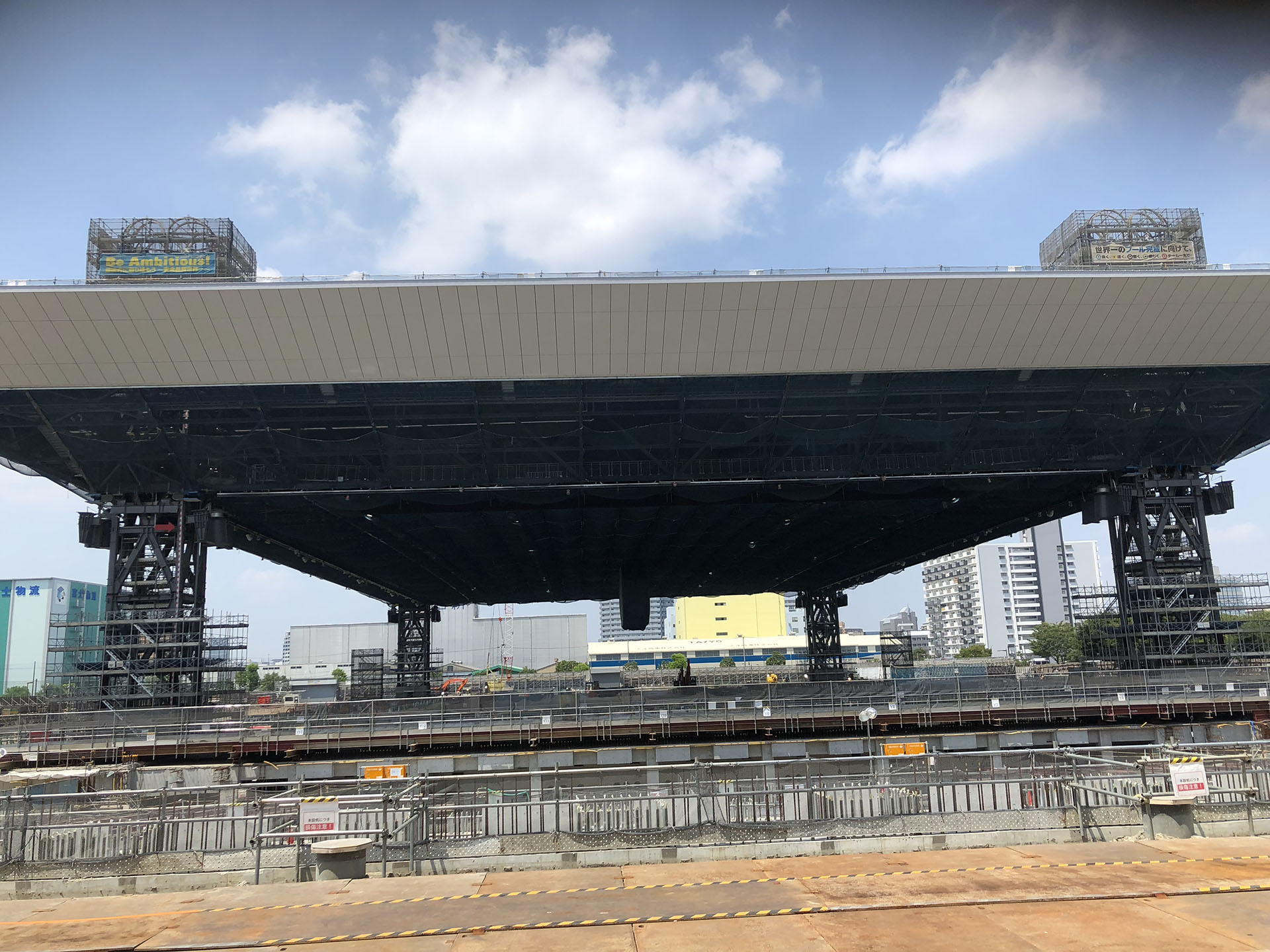アクアティクスセンター新築工事において、大屋根四隅にあるメガ柱上に油圧制御機器類を設置し、地上で構築した大屋根のリフティング工事を担当しました。大屋根の面積は160m×130m(20,800㎡)、重量は7,000tにもおよび、25mのリフティング工事中は大屋根から離れた場所の地上指令室から油圧制御機器類を遠隔操作しました。油圧制御機器類の通信はLANケーブルを採用する事で制御ケーブル類の簡素化も実現しました。