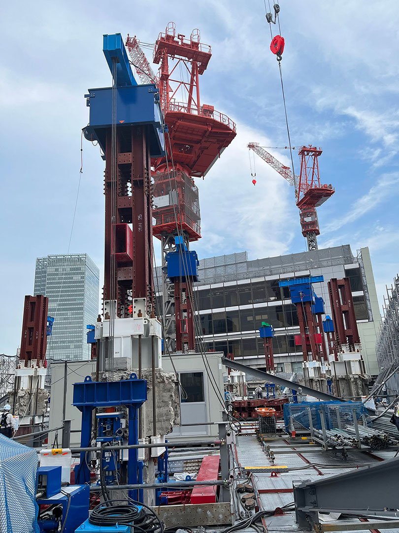 新宿駅西口再開発計画において、既存建物解体に伴う専用鉄骨フレームのロワリング工事を担当しました。都市部で現場周辺には通行人も多く、粉塵や騒音の拡散に配慮した閉塞型の解体工法が採用され、工期も限られていた事から高難度の技術が求められました。専用鉄骨フレームの2階層下までの躯体を先行解体後に、既存の柱を利用して専用鉄骨フレームを10日タクトで1階層ずつロワリング工事を繰り返し行いました。最新の制御プログラムを実装する事で、よりシビアな管理を実現し3棟の既存建物を解体しました。